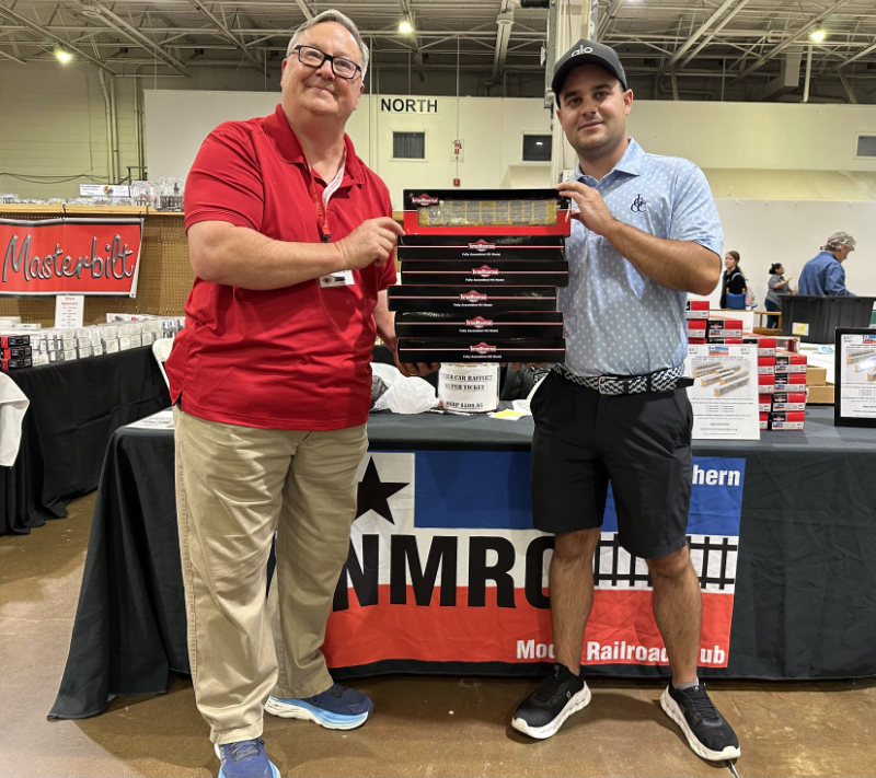 The Texas Northern Model Railroad Club congratulates Jake Lowe of Dallas, winner of our exclusive production run of MKT auto racks raffle at the World's Greatest Hobby train show held in Dallas, Texas March 28-29- 2026. Jake purchased just one $5.00 raffle ticket of the almost 200 sold and walked away with an incredible set of 6 HO scale auto racks — a $600 value! The individual cars, or a complete set of all 6 different car numbers, are still available on our website while supplies last. Thank you to everyone who bought raffle tickets and support the Texas Northern Model Railroad Club. Pictured above is Texas Northern President Curtis Roughton Jr. presenting Jake with his cars at the close of the WGH show on Sunday.